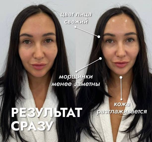 За счет стимуляции коллагена кожа становится плотнее, а цвет лица — ровным и здоровым.